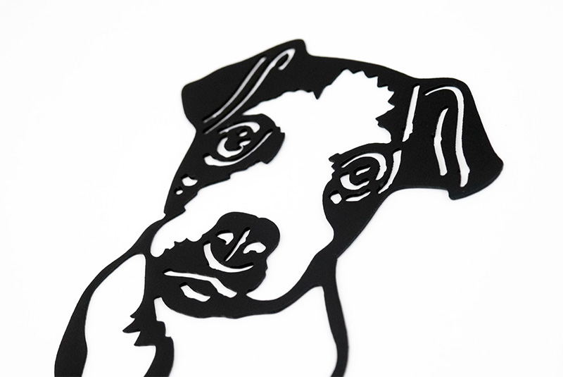 The cut-out captures the spirited, energetic and playful personality, with confident stance of a Jack Russell. The cut-out features the breed’s signature features, including its upright, curious ears, alert expression, and spirite. This piece is a fun and stylish tribute to the adventurous nature of the breed