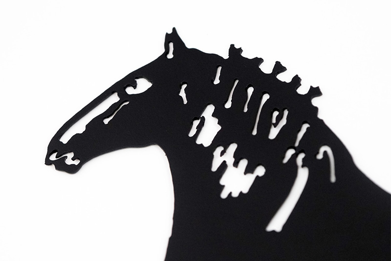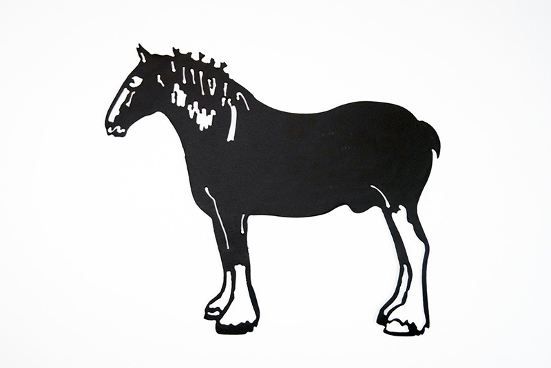 This elegant, powder-coated steel silhouette celebrates the gentle strength and majestic presence of the Clydesdale horse. The minimalist design captures the breed’s iconic features, including its powerful, muscular build and the luxurious, flowing feathering on its lower legs, creating a stunning piece of equine art