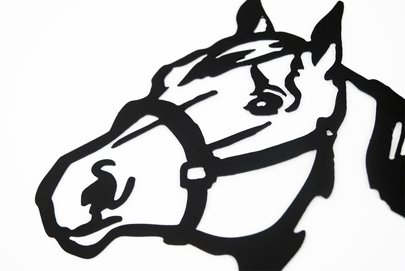 The image displays a stylized, monochromatic silhouette or outline of a horse’s head in profile, which features sharp, precise lines that define the contours of the horse’s head, including its muzzle, jawline, ears, and neck.