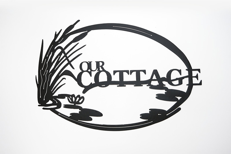This beautifully crafted metal sign features the heartfelt declaration “OUR COTTAGE” in a classic, inviting font, framed within a distinctive oval shape. The design is artfully enhanced with delicate laser-cut details, including graceful cattails or reeds and subtle water-like reflections, evoking the serene beauty of a lakeside or riverside cottage setting.