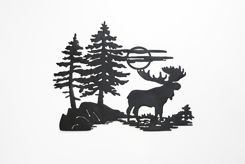 Bring the majestic spirit of the wilderness into your home or cabin with this stunning Moose & Pine Tree Steel Sign! Crafted with precision from durable steel, this striking silhouette captures the serene beauty of a moose amidst a forest of towering pine trees, silhouetted against a setting or rising sun.