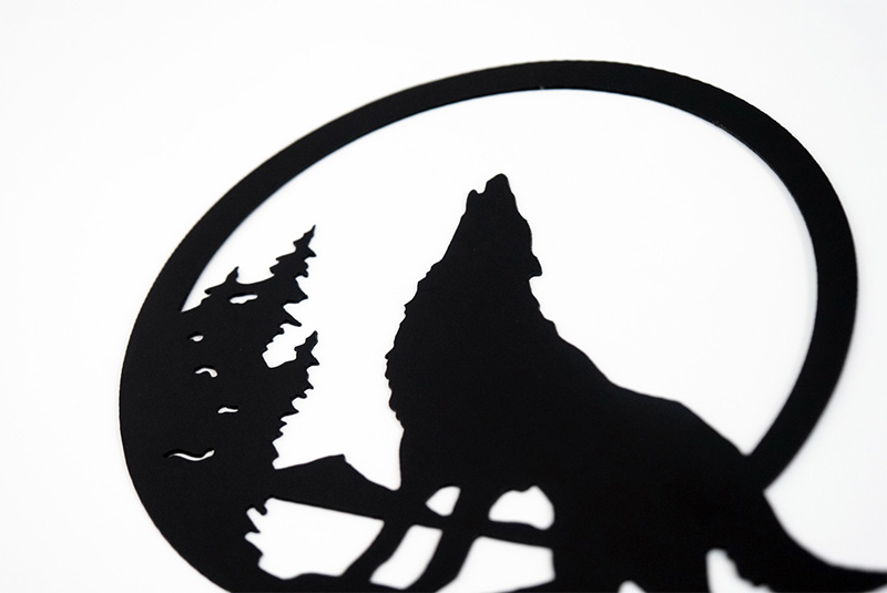 This stunning steel sign features a captivating silhouette design of a wolf howling majestically at a full moon, encircled within a striking round frame. The intricate details include a stylized forest landscape and rocky terrain beneath the wolf, creating a serene wilderness scene.